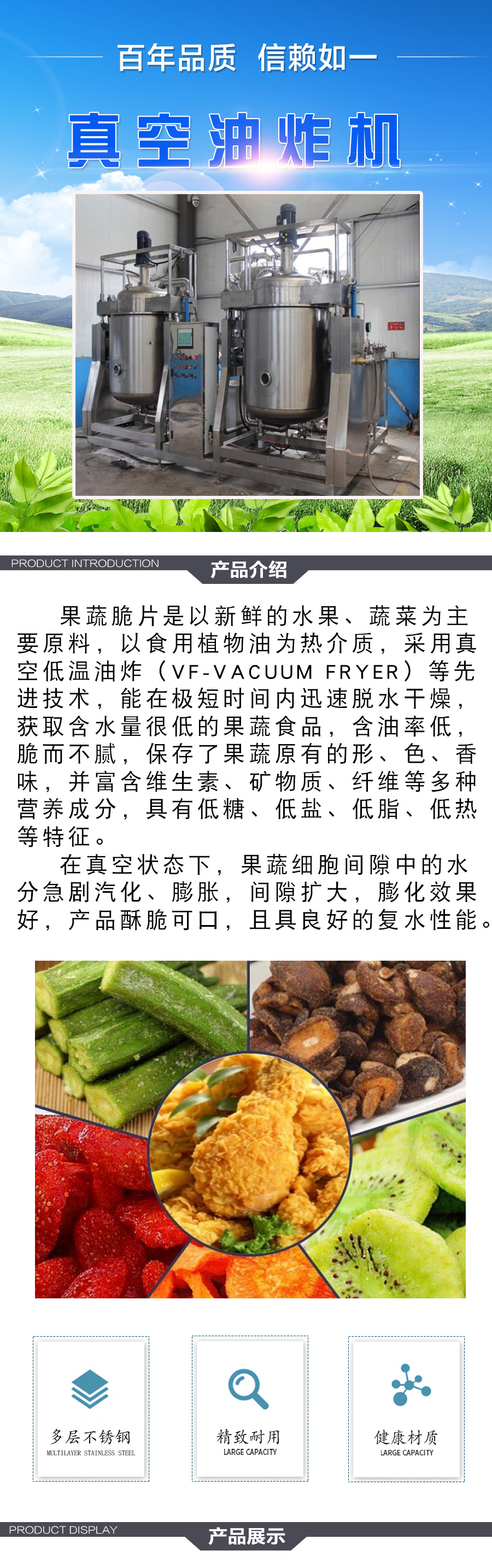 ●真空油炸是在低温(70~110℃)对食品进行油炸、脱水,可以有效地减少高温对食品营养成分的破坏。